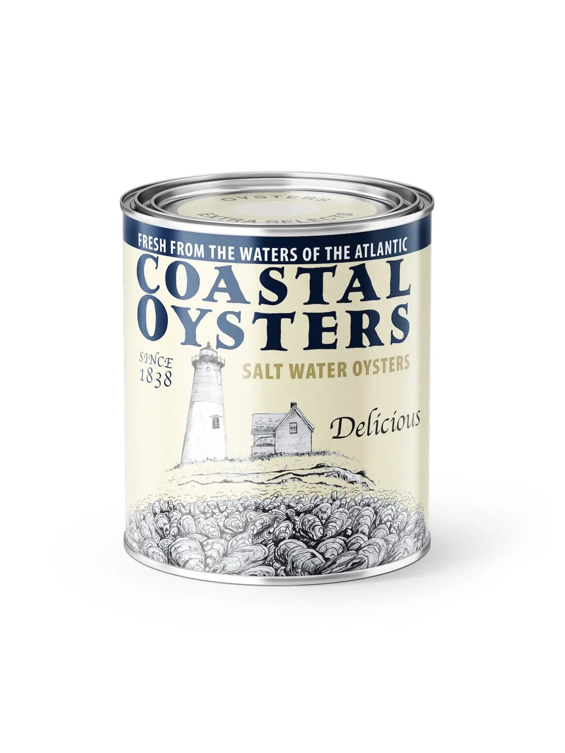 A citrus scented hand-poured candle made with renewable coconut wax with a label designed by pop artist Ramon Matheu and celebrating the history of the great oyster harvest.